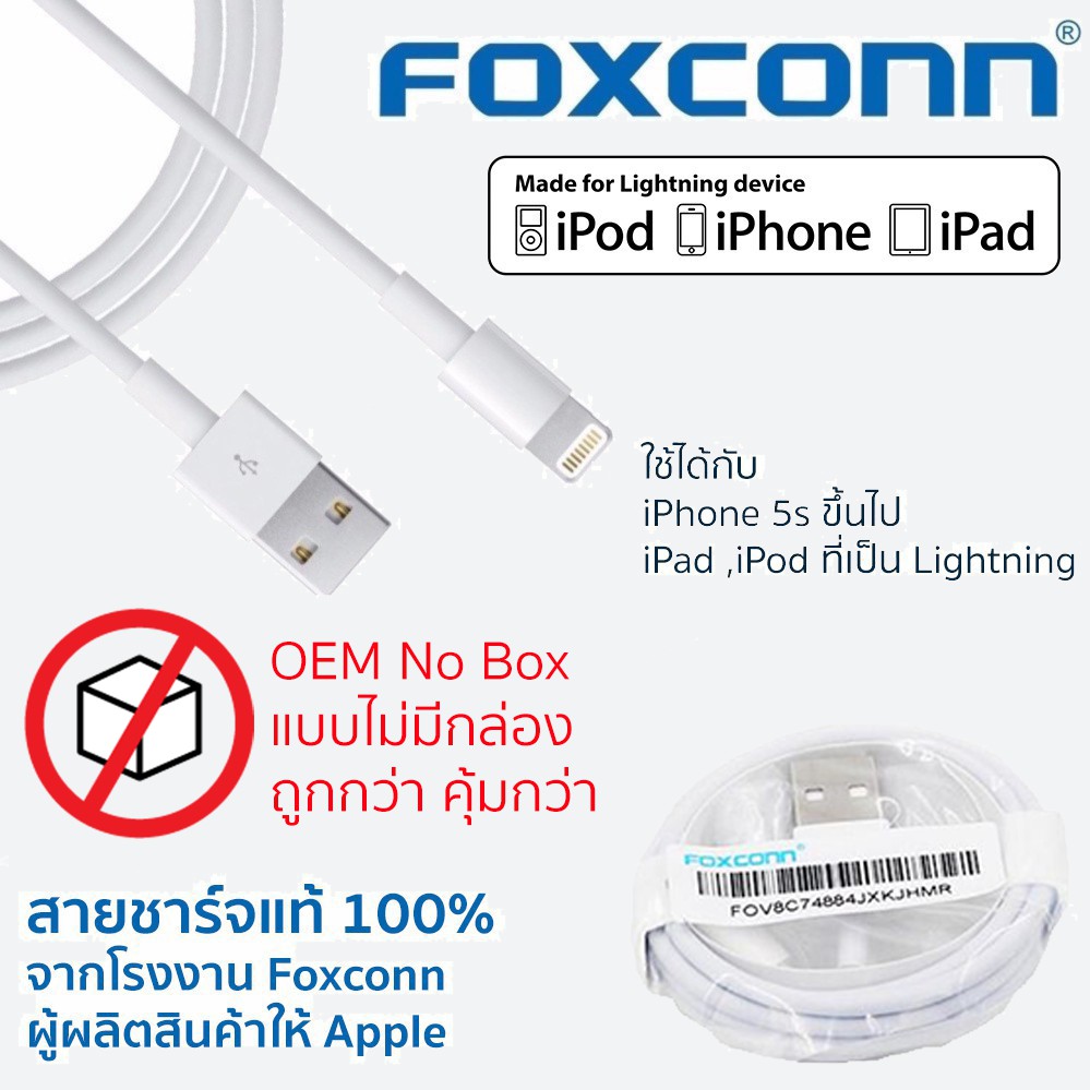 - ราคา สายชาร์จไอโฟน ของแท้ 100% ผลิตโดย Foxconn รุ่นไม่มีกล่อง ชิป E75 มี Serial USB Cable Lightning Apple